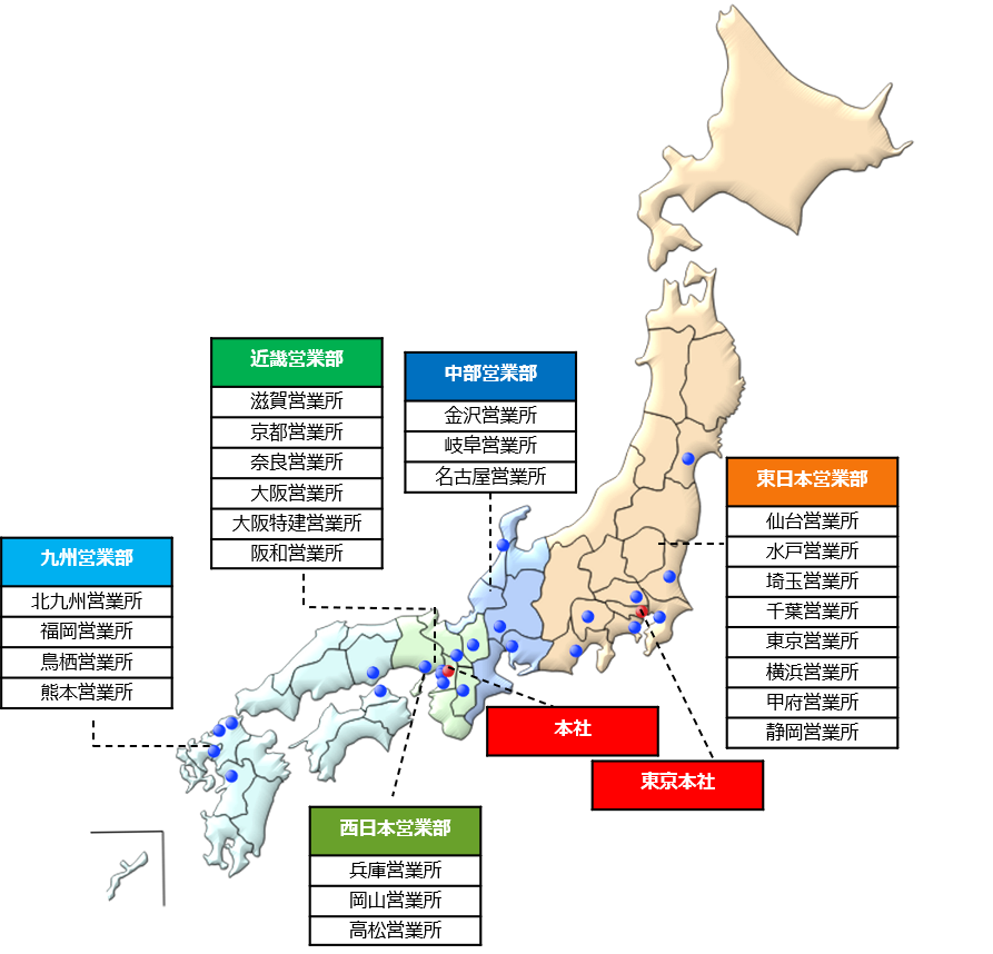 仙台から熊本まで、全国24箇所に営業所を持つ当社は、全国各地の施工に係わる協力業者と強いパートナーシップで結ばれています。